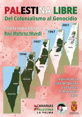 La Plataforma de Canarias por Palestina en La Palma, junto a Sanitari@s con Palestina y en colaboración con el Ayuntamiento de San Andrés y Sauces, organiza la charla ‘Palestina Libre, del colonialismo al genocidio’, que tendrá lugar el lunes 9 de febrero, a las 18:00 horas, en el Teatrino de la Casa del Quinto. Además, bajo el mismo título y durante la mañana, también se realizará un encuentro con el alumnado del IES Cándido Marante Expósito de San Andrés y Sauces. Ambas charlas serán impartidas por Rají Mohrez Muvdi, médico y activista palestino residente en Canarias desde hace muchos años. Rají forma parte de la agrupación Sanitari@s con Palestina y es además realizador del documental ‘Palestina libre, del colonialismo al genocidio’, una obra que recorre la historia de Palestina desde la antigüedad hasta la actualidad, con el objetivo de “contextualizar el proceso colonial y poner el foco en la barbarie que el pueblo palestino ha sufrido y sigue sufriendo en nuestros días”. “Este encuentro se plantea como un espacio de información, análisis y reflexión crítica, abierto a la ciudadanía, para comprender las raíces históricas del conflicto y la gravedad de la situación actual, marcada por la violencia sistemática y la vulneración constante de los derechos humanos, especialmente en Gaza”. Desde la organización se vuelve a subrayar “la importancia de generar espacios de concienciación y debate desde el ámbito local, entendiendo que el conocimiento y la toma de conciencia son herramientas fundamentales para la defensa de la justicia internacional y la solidaridad entre los pueblos”. La Plataforma de Canarias por Palestina en La Palma invita a asistir a esta charla y a participar en un encuentro que busca “aportar claves para comprender una realidad que sigue desarrollándose ante nuestros ojos y que interpela directamente a la sociedad civil”.