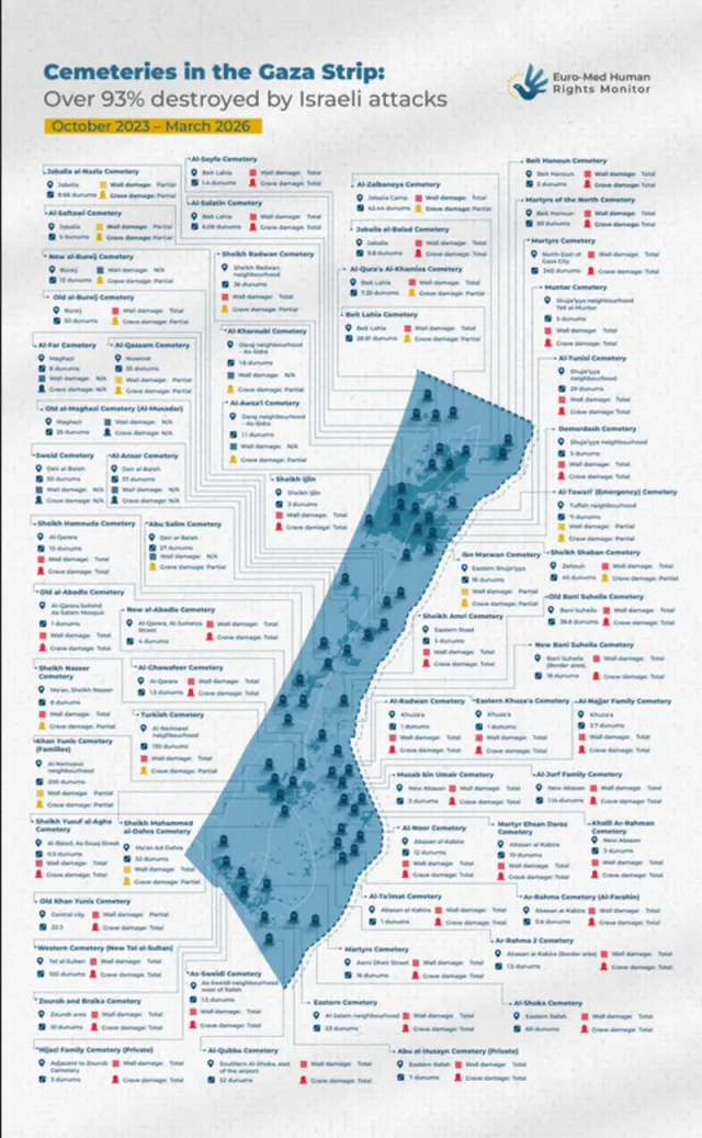 Cemeteries in the Gaza Strip, over 93% destroyed by Israeli attacks. En Gaza, más del 93% de los cementerios destruidos por Israel