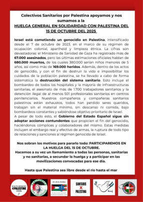 Miércoles 15 de octubre, 2025. Huelga general en solidaridad con Palestina. Apoyamos y nos sumamos colectivos sanitarios por Palestina