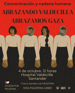 "Abrazando a Valdecilla, abrazamos Gaza" 4 de octubre, sábado, a las 12. La acción consistirá en formar una corro de activistas rodeando el hospital de Valdecilla en Santander. MANIFIESTO ABRAZANDO A VALDECILLA ABRAZAMOS GAZA Abrazando a Valdecilla, nuestro hospital de referencia de la sanidad pública en Cantabria,abrazamos a Gaza cuyo sistema de salud ha sido destruido en el curso del genocidio infligidopor Israel en los dos últimos años sobre el pueblo palestino. “La sociedad humana se basa en la paz y la solidaridad. El sistema sanitario es unamanifestación política y práctica de esos dos principios y su destrucción socava los principiosmismos de la Humanidad.” 1 “El sistema sanitario en Gaza ha sido destruido de manera deliberada y sistemática por elestado de ocupación de Israel que está cometiendo un genocidio contra el pueblopalestino” a la vista del mundo entero. Estamos presenciando a diario los “crímenes deguerra, de lesa humanidad y el exterminio que perpetra el ejército sionista con ataquesimplacables y deliberados contra el personal y las instalaciones sanitarias. Nuestrascompañeras y compañeros sanitarios palestinos trabajan bajo bombardeos constantes, sonencarcelados, torturados en campos de detención y asesinados.” A solo tres meses del inicio de esta fase del genocidio, el 5 de enero de 2024, el Ministeriode Salud de Gaza declaraba que al menos 326 miembros del personal médico y de ladefensa civil habían sido asesinados y que 30 hospitales y 150 centros de salud y otrasinstituciones sanitarias habían cesado sus actividades debido a los ataques israelíes y a laescasez de combustible necesario para operar los generadores de energía. Un año y nueve meses después, al cumplirse dos años del genocidio, han muerto más de1200 profesionales sanitarios, el 94% de los hospitales han sido alcanzados por los ataques,y, la mayoría, convertidos en escombros, (posiblemente el 100% en este momento deallanamiento y destrucción total del norte de Gaza). Los que quedan en pie, siguentrabajando entre escombros, funcionan con unos medios absolutamente insuficientes,teniendo que operar sin anestesia y sin ningún tipo de garantía sanitaria, debido a la falta deantibióticos y medicamentos esenciales, a miles de niñas y niños mutilados por las bombas. La hambruna a la que ha condenado el estado genocida de Israel a la población gazatí llenalos centros de salud y hospitales parcialmente funcionales de criaturas en estado deinanición junto a sus madres que apenas se sostienen en pie, mientras sus padres yhermanos son asesinados en los puntos de distribución de alimentos convertidos entrampas mortales. El genocidio en Gaza cuestiona profundamente la práctica médica y sanitaria diaria decualquier profesional en Cantabria y en cualquier lugar del mundo. Muchas y muchossanitarios se preguntan qué sentido tiene ejercer la profesión para cuidar y mejorar la saludde la población, mientras al otro lado del Mediterráneo la vida se elimina drásticamente, díatras día, bajo el arsenal bélico producido en Estados Unidos y la Unión Europea. La sociedad civil aumenta la protesta ante el horror del genocidio mientras sus gobernantes,manteniendo su inacción, siguen siendo cómplices del mismo. La ciudadanía y “los profesionales de la salud no podemos permanecer en silencio frente aesta masacre. Debemos fortalecer y consolidar nuestro apoyo a Palestina”, a su derecho aexistir en paz y libertad, “con el objetivo de poner fin al genocidio, al apartheid y a laocupación”. “Combatir la destrucción física de la infraestructura y el sistema sanitariopalestino es un esfuerzo paralelo a la defensa del sistema público de salud” en nuestracomunidad autónoma y en nuestro país, frente a su acelerada destrucción.Por todo ello, como trabajadoras y trabajadores de la salud y como sociedad humanaexigimos al gobierno de Cantabria, a las instituciones sanitarias y al gobierno del EstadoEspañol:- que se posicionen públicamente por el fin del genocidio, de la ocupación y del apartheid deIsrael contra el pueblo palestino- que rompan relaciones institucionales, comerciales, culturales y deportivas con el estadosionista de Israel- que el gobierno de España haga efectivo el embargo de armas con Israel y rompa loscontratos en vigor o en trámite para la compra de armamento- que se boicotee a empresas vinculadas a Israel, como TEVA, la mayor productora demedicamentos genéricos, así como a todos los productos fabricados por Israel o por algunade sus empresas afiliadas en España y por lo tanto cómplices- que se cumpla con el cierre de puertos y aeropuertos de tránsito desde y hacia Israel conmercancías de todo tipo y naturaleza y se prohíba la entrada de todo ciudadano israelí quepor acción o divulgación de discursos genocidas estén contribuyendo al genocidio o ejerzancualquier acción de blanqueamiento del mismo- que se autorice y agilice la acogida a personas con necesidades de cuidados sanitarios yrefugiadas de Gaza y Cisjordania Con este manifiesto queremos hacer llegar a nuestras compañeras y compañeros sanitariosen Gaza y a todo el pueblo palestino nuestra solidaridad y dolor por su sufrimiento.Seguiremos manifestándonos públicamente hasta que Palestina pueda vivir libre y en paz ensu territorio.¡Viva Palestina libre! 1 Este manifiesto recoge puntos del manifiesto (entre comillas) de Health Wokers for Palestine España al que nos adherimos desde Acción Palestina Cantabria. https://hw4p.es/manifiesto-por-la-salud-de-healthcare-workers-4-palestine-spain