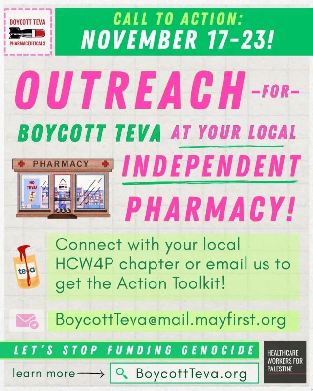The HCW4P has called for days of an outreach campaign to pharmacies from Nov. 17 to Nov. 23. For more information on the HCW4P and the “Boycott Teva” campaign: Health Workers 4 Palestine and BoycottTeva.org.