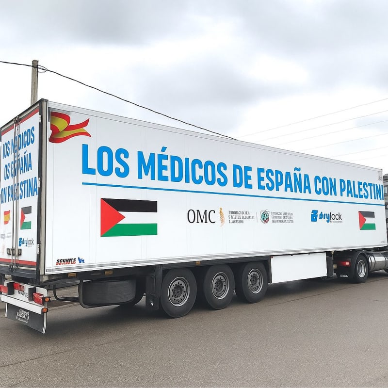 Noticia FALSA, 2025: Un camión fletado por la Organización Médica Colegial de España lleva solidaridad material a Palestina.