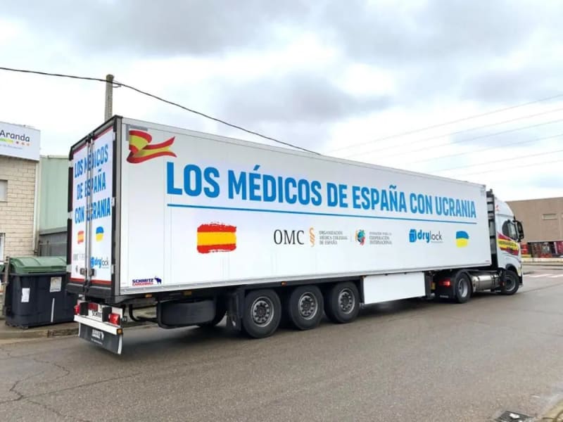 Noticia CIERTA, 2022: Un camión fletado por la Organización Médica Colegial de España lleva solidaridad material a Ucrania.