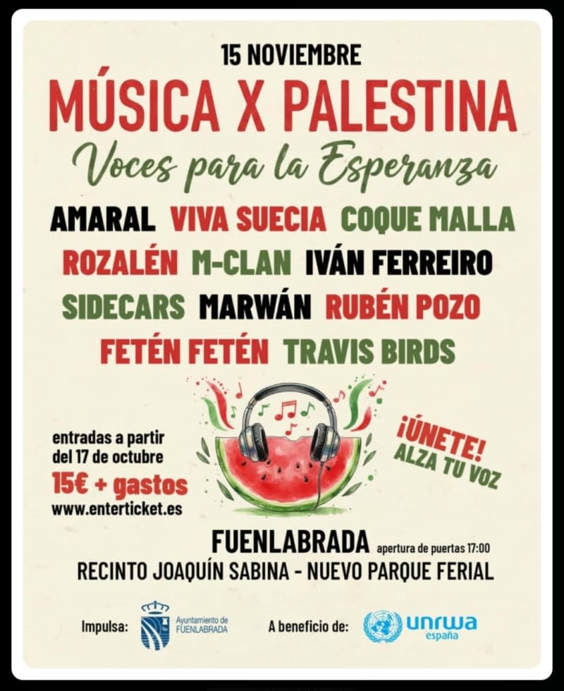 Voces para la Esperanza. El próximo 15 de noviembre, a las 17:00 horas, el Recinto Joaquín Sabina de Fuenlabrada se llenará de música y solidaridad con el concierto Música por Palestina. La iniciativa, organizada con fines benéficos, destinará los beneficios a la UNRWA (Agencia de la ONU para las personas refugiadas de Palestina). Al cartel, que hace poco anunciaba la presencia de Rozalén, M-Clan, Iván Ferreiro, Marwán, Rubén Pozo, Fetén Fetén y Travis Birds, se suman ahora Amaral, Viva Suecia, Coque Malla y Sidecars. Una programación que promete música de calidad y un mensaje de apoyo y conciencia global. Entradas a la venta para 'Música X Palestina', el concierto solidario en Fuenlabrada con Rozalén, Iván Ferreiro y M-Clan Las entradas tienen un precio de 15 euros (más gastos de gestión) y pueden adquirirse ya en Enterticket.es. El alcalde de Fuenlabrada, Javier Ayala, ha destacado que “este concierto será un altavoz para quienes no pueden ser escuchados y para miles de personas que sufren en Gaza la violencia y el hambre. Fuenlabrada demuestra que la cultura es una herramienta poderosa para exigir el fin de la violencia y sembrar esperanza”. Sobre la UNRWA La UNRWA proporciona asistencia a casi seis millones de personas refugiadas palestinas, incluyendo educación, sanidad, alimentos y otros servicios esenciales. En Gaza, más de 12.000 profesionales trabajan diariamente para garantizar ayuda humanitaria a más de dos millones de personas, la mitad de ellas niños y niñas. Información práctica Evento: Música por Palestina. Voces para la Esperanza Fecha y hora: 15 de noviembre, 17:00 h Lugar: Recinto Joaquín Sabina, Fuenlabrada Entradas: 15 € + gastos de gestión (Enterticket.es)Leer completo...