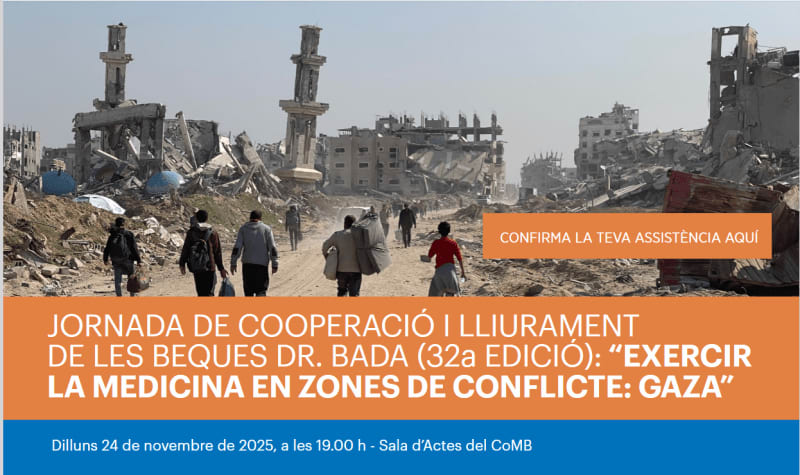 “EXERCIR LA MEDICINA EN ZONES DE CONFLICTE: GAZA” 24 novembre 2025, 19.00 h - Col·legi de Metges de Barcelona. Inscripció presencial aquí PROGRAMA19.00 h. BenvingudaElvira Bisbe, presidenta del Col·legi de Metges de Barcelona. 19.15 h. Conferència: "Exercir la Medicina en zones de conflicte: Gaza"Presentació del ponent:Iñaki Alegria, president de la Secció de Metges Cooperants. Col·legi de Metges de Barcelona.Conferenciant:Raúl Incertis, metge d’Urgències i Anestesiòleg. Equips Mèdics d’Emergències de l’OMS a Gaza. 19.45 h. Torn de preguntes 20.00 h. Lliurament de les Beques Dr. Bada 2025Ethel Sequeira, vicepresidenta de la Secció de Metges Cooperants. Col·legi de Metges de Barcelona.Nuria Serre, coordinadora del Master SI i Cooperació i de la Unitat de Salut Internacional i Malalties Transmissibles Drassanes-Vall d’Hebron. 20.15 h. CloendaEthel Sequeira, vicepresidenta de la Secció de Metges Cooperants. Col·legi de Metges de Barcelona.Leer completo...