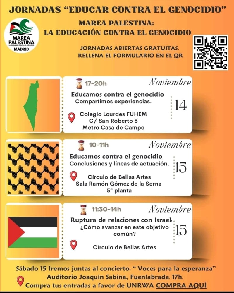 Jornadas EDUCAR CONTRA EL GENOCIDIO - Marea Palestina Madrid Para asistencia, registro aquí 📅Viernes 14 🕔17-20h - Educamos contra el genocidio: Compartimos experiencias. 📍Colegio Lourdes FUHEM (c/ San Roberto, 8). 📅Sábado 15 🕙10-11h - Educamos contra el genocidio: Conclusiones y líneas de actuación. 📍Círculo de Bellas Artes: Sala Ramón Gómez de la Serna (5ª planta). 📅Sábado 15 🕦11:30-14h - Ruptura de relaciones con Israel: Cómo avanzar en este objetivo común. 📍Círculo de Bellas Artes: Sala Ramón Gómez de la Serna (5ª planta). Para el sábado 15 por la tarde (a partir de las 17h), te invitamos a comprar tu entrada para el concierto solidario por Gaza en Fuenlabrada (Recinto Joaquín Sabina) a beneficio de la UNRWA: https://www.enterticket.es/eventos/musica-x-palestina-952986.Leer completo...