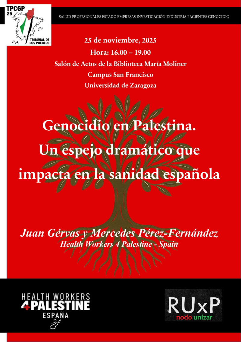 Genocidio en Palestina Un espejo dramático que impacta en la sanidad española (y viceversa) Zaragoza, 25 de noviembre, 2025. de 16,00 a 19,00 h, en el Salón de Actos de la Biblioteca María Moliner, campus San Francisco, de la Universidad de Zaragoza Momento preparatorio para el Tribunal de los Pueblos sobre la Complicidad con el Genocidio palestino en el Estado español TPCGP-25 (a celebrar en Madrid los días 28 y 29 de noviembre) Justificación El Genocidio que comete el estado colonial de Israel sobre el Pueblo Palestino desde 1948 se basa en el robo de tierras y recursos, y en el desplazamiento y asesinato masivo de la población, imponiendo condiciones que derivan en enfermedades, sufrimiento y muertes. No es que “simplemente” robe tierras y recursos, es que además asesina, enferma, tortura y mutila causando sufrimiento inmenso (en gran parte irreparable). Ninguna persona, y menos siendo profesional de la salud y de lo social, puede quedar en silencio ante un Genocidio pues el grito del pueblo herido traspasa fronteras y Estados. El Genocidio atenta contra el derecho y rompe todo compromiso jurídico internacional consagrado en el art. 24 de la Declaración de los Derechos Humanos, así con otros derechos humanos relacionados con la salud que conforman el acerbo internacional1. Es cuestión de ética y de salud pública, de derechos humanos, dignidad, justicia social, solidaridad y ternura. La inacción y la complicidad son dos elementos que derivan en el mismo destino del Pueblo Palestino: el Genocidio ante el Mundo por un modelo neoliberal que destruye toda solidaridad entre personas. Las mismas lógicas coloniales e imperialistas están presentes en todo sistema de salud cuando se le somete a la mercantilización y la precarización profesional. Así, la complicidad y la inacción ante el Genocidio de Pueblo Palestino impacta en los testigos que con su insensibilidad demuestran padecer una lepra social que les afecta también en el quehacer diario, en el trabajo clínico en el caso de profesionales de la sanidad y social (y de sus pacientes). El Genocidio es un proceso de exclusión permanente del Derecho a la Protección de la Salud de millones de personas. Propósito ¿Cuáles son las implicaciones del Genocidio del Pueblo Palestino en el sistema de salud público del Estado español, en qué forma somos cómplices por acción y omisión? Esta fue la pregunta inicial para preparar la participación sanitaria en el Tribunal de los Pueblos sobre la Complicidad con el Genocidio Palestino en el Estado español (TPCGP-25) organizado por la Red Universitaria por Palestina2. El objetivo del TPCGP-25 es investigar, en diferentes campos, la complicidad española con el Genocidio del Pueblo Palestino por parte de terceros y las responsabilidades con respecto al apartheid, la ocupación ilegal y otras formas de violación del Derecho Internacional por parte del estado colonial de Israel. Una de las importantes temáticas que tratará el TPCGP se refiere a las implicaciones en el sistema de salud palestino y su relación de complicidad con el Estado español. Si se pretende un Genocidio, nada como arrasar el sistema sanitario y asesinar, detener y torturar a sus profesionales pues al tiempo se elimina un determinante de salud social clave y una expresión de solidaridad que aglutina a la sociedad. El Genocidio del Pueblo Palestino debe cuestionar las prácticas de los profesionales de la salud y de lo social. La indiferencia y la conmoción que no lleva a acciones se paga con pérdida de valores esenciales en el trabajo clínico y en la vida personal y social. El cuestionamiento de los vínculos de complicidad con empresas y organizaciones, que aumentan sus beneficios desde la articulación con el sistema de salud español, pone en entredicho la función de los profesionales y la infraestructura de salud y social. Se pasa del “primum non nocere” (primero no dañar), fundamento de la clínica, al “primun nocere” (primero dañar), fundamento del estado colonial de Israel, lo que conlleva una insensibilidad, una lepra social, que termina afectando también a los testigos, por lejanos que estén, y en concreto al quehacer diario de profesionales de sanidad y social en España, El espacio, abierto a toda la comunidad universitaria, pretende definir las implicaciones en el sistema de salud español, así como las responsabilidades de profesionales y entidades públicas para combatir y contrarrestar la destrucción del sistema sanitario palestino siendo un ejercicio vital de defensa de todo sistema público de salud, ante la mercantilización y privatización del Derecho a la Salud de la población. Scaletta 16.00 – 16.30: Presentación de los/las invitados/as e introducción de los objetivos 16.30 – 17.30: Health Workers for Palestine (Spain); 1/ España en la 77 Asamblea Mundial de la Salud de 2024, 2/ Silencio y complicidad desde las colegios profesionales y sociedades científicas, 3/ Presencia israelí en congresos y otras actividades de formación, 4/ Ausencia de apoyo sanitario desde España a enfermos y heridos gazatíes, 5/ La I+D+i en el ámbito sanitario y sociosanitario y 6/ Relaciones comerciales con Israel en el ámbito sanitario, sociosanitario y farmacéutico (Teva). Por Juan Gérvas y Mercedes Pérez-Fernández Juan Gervas, médico rural jubilado, exprofesor de salud pública en la Universidad Johns Hopkins (Estados Unidos) y miembro de Profesionales de la Sanidad por Palestina España (HW4PS) Mercedes Pérez-Fernández, médica rural jubilada, especialista en Medicina Interna, Equipo CESCA, Madrid y miembro de Profesionales de la Sanidad por Palestina España (HW4PS) 17.30 – 18.00: Intervención de las personas y organizaciones presentes 18.00 – 18.30: Invitación a la participación en el TPCGP-25 18.30 – 19.00: Cierre. Materiales para consulta Health Workers for Palestine, Spain (HW4PS). https://hw4p.es/ Gérvas J, Pérez-Fernández M. Primum nocere.