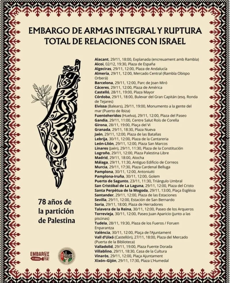 Volveremos a llenar las calles por PALESTINA y saldremos los días 28, 29 y 30 de noviembre en más de 33 ciudades y pueblos (detalles en cartel adjunto) Hace 78 años, el 29 de noviembre de 1947 la Asamblea General de las Naciones Unidas, reunida en Nueva York, aprobó la Resolución 181, la cual recomendaba un Plan de Partición de Palestina. El Plan de Partición sionista de 1947 dio inicio a una injusticia histórica: la colonización y expulsión del pueblo palestino. Hoy seguimos viendo cómo Israel perpetúa la ocupación, el apartheid y el genocidio con la complicidad de los gobiernos que miran hacia otro lado. – Exigimos un embargo integral de armas a Israel. – Reclamamos la ruptura de relaciones diplomáticas, comerciales y militares con un estado que viola sistemáticamente los derechos humanos. – Defendemos el derecho del pueblo palestino a vivir libre, en su tierra y con dignidad. CGT llama a toda la afiliación y a toda la ciudadanía a acudir a estas y a todas las movilizaciones que se convoquen por el fin del genocidio y el apartheid en Palestina, y por verdad, justicia y reparación para el pueblo Palestino. Ciudades que se adhieren Porque Palestina no está sola.Porque el silencio también mata.Únete a la movilización y alza tu vozLeer completo...
